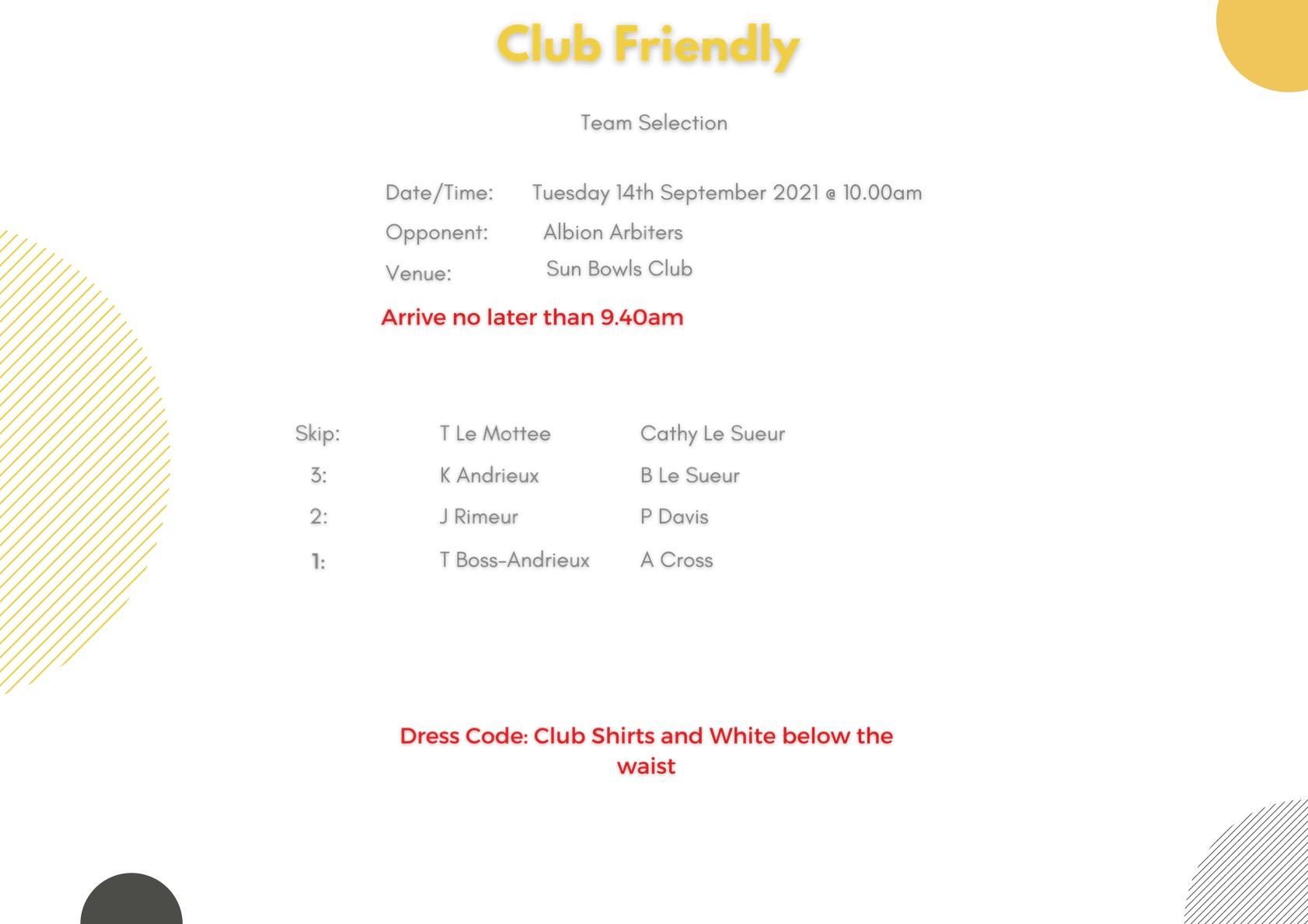 Club Friendly v Albion Arbiters: Tuesday 14th September @ 10am